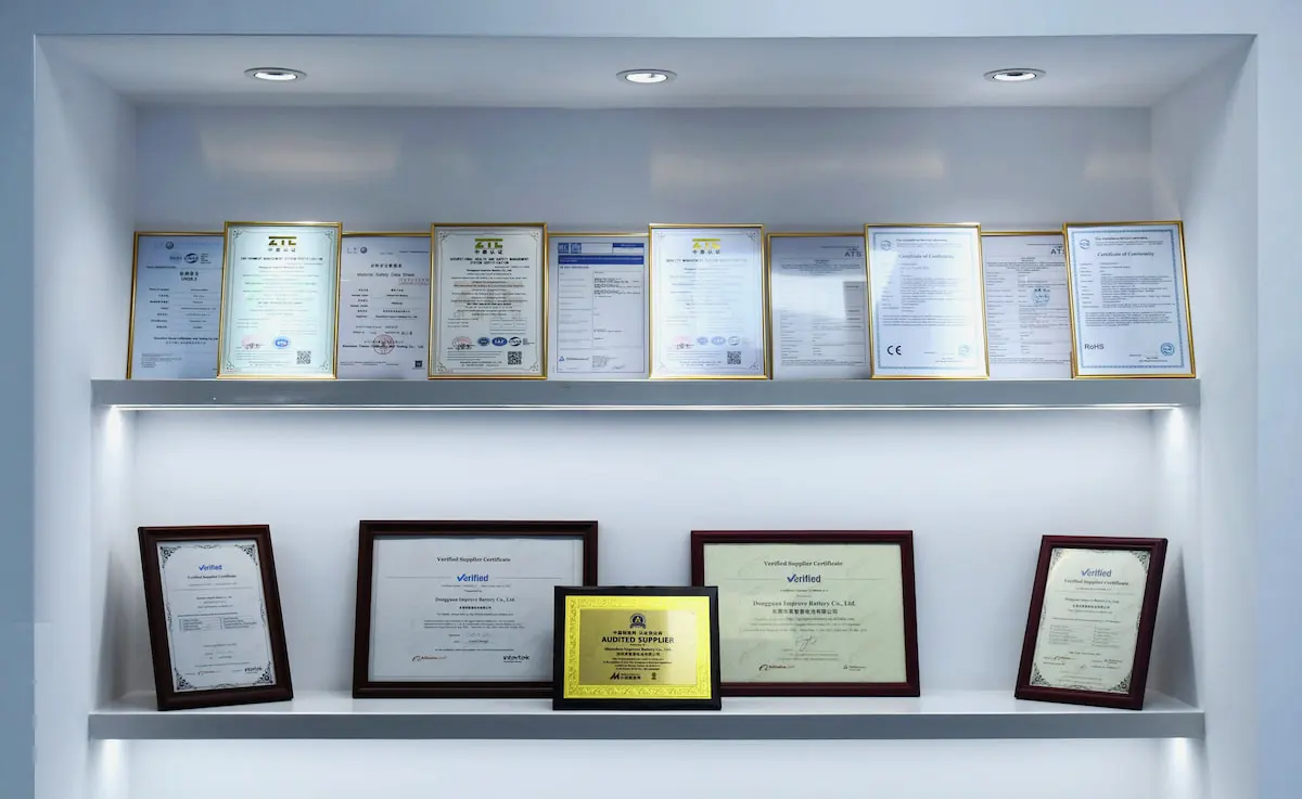 Our commitment to quality is official. Our new factory is fully certified. We hold the ISO 9001, ISO 14001, and ISO 45001. Our products also meet global standards like KC, PSE, IEC62619, CB, UL, BIS, UN38.3, MSDS, and CE. These certificates are our promise to you. We promise safe, high-quality, and certified products.